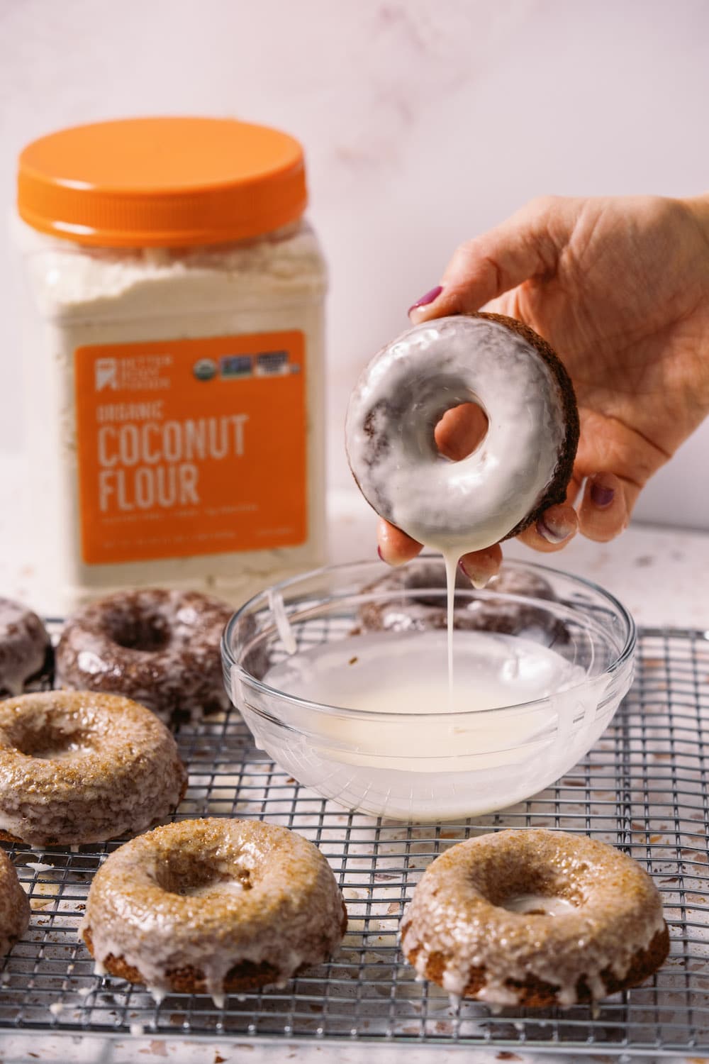 Preheat the oven to 350°F and grease a standard donut pan. In a small bowl, whisk together the coconut flour, coconut palm sugar, baking soda, cinnamon, salt, eggs, oil, and apple cider. Allow the dough to rest for about 2 minutes to ensure the moisture is absorbed by the coconut flour. Pipe the dough into the doughnut pan and bake for 15-18 minutes. Remove from the oven and allow to cool for about 2-3 minutes and then turn out onto a cooling rack. To make the glaze in a small bowl add the powdered sugar and apple cider and stir to combine. Dip the cooled doughnuts into the glaze and sprinkle with cinnamon sugar if desired.