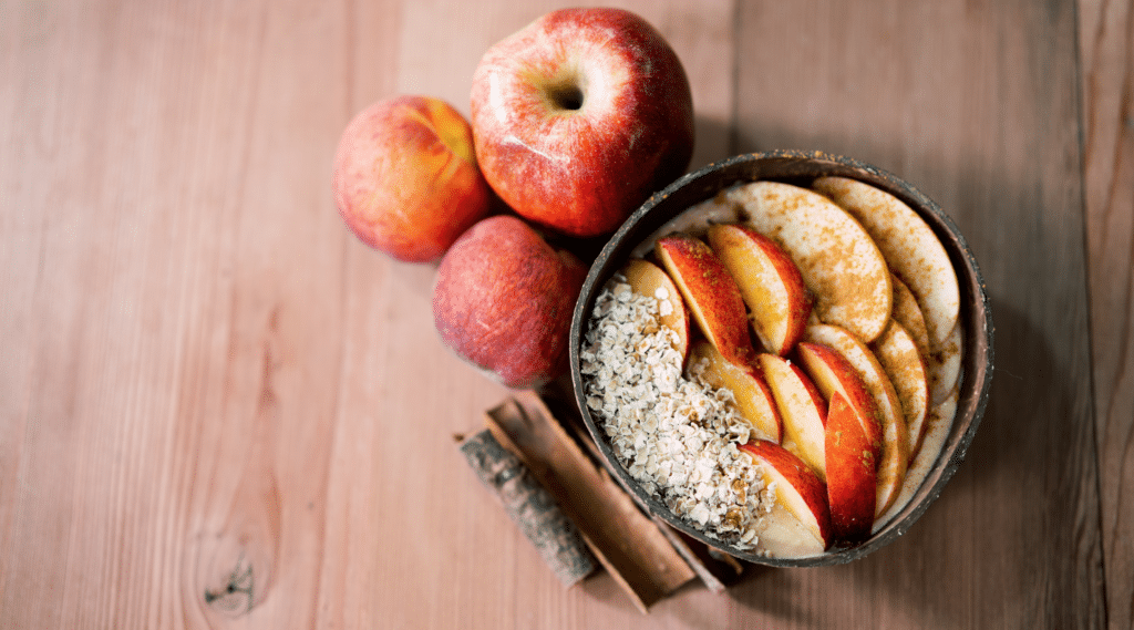 Blend together almond milk, vanilla protein and PBfit until smooth. Divide in to 2 bowls and top with apples, peaches, oats and cinnamon. Enjoy!