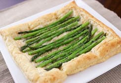 4. Remove pastry shell from oven, and sprinkle with Gruyere. Trim the bottoms of the asparagus spears to fit crosswise inside the tart shell; arrange in a single layer over Gruyere, alternating ends and tips. Brush with oil, and season with salt and pepper.
