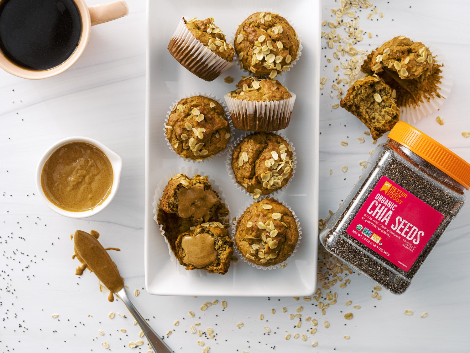 1. Preheat the oven to 400°F. 2. In a tabletop mixer, combine coconut oil, agave, chia, vanilla, oat milk, nut butter and bananas and mix together until smooth. 3. In a medium size bowl mix flour, baking soda, xanthan gum, super seeds and salt together. 4. While mixing add dry mixture to wet mixture. 5. Line a 12-cup muffin pan with liners and divide the batter among them. Top with oats. 6. Bake for 18 to 20 minutes.
