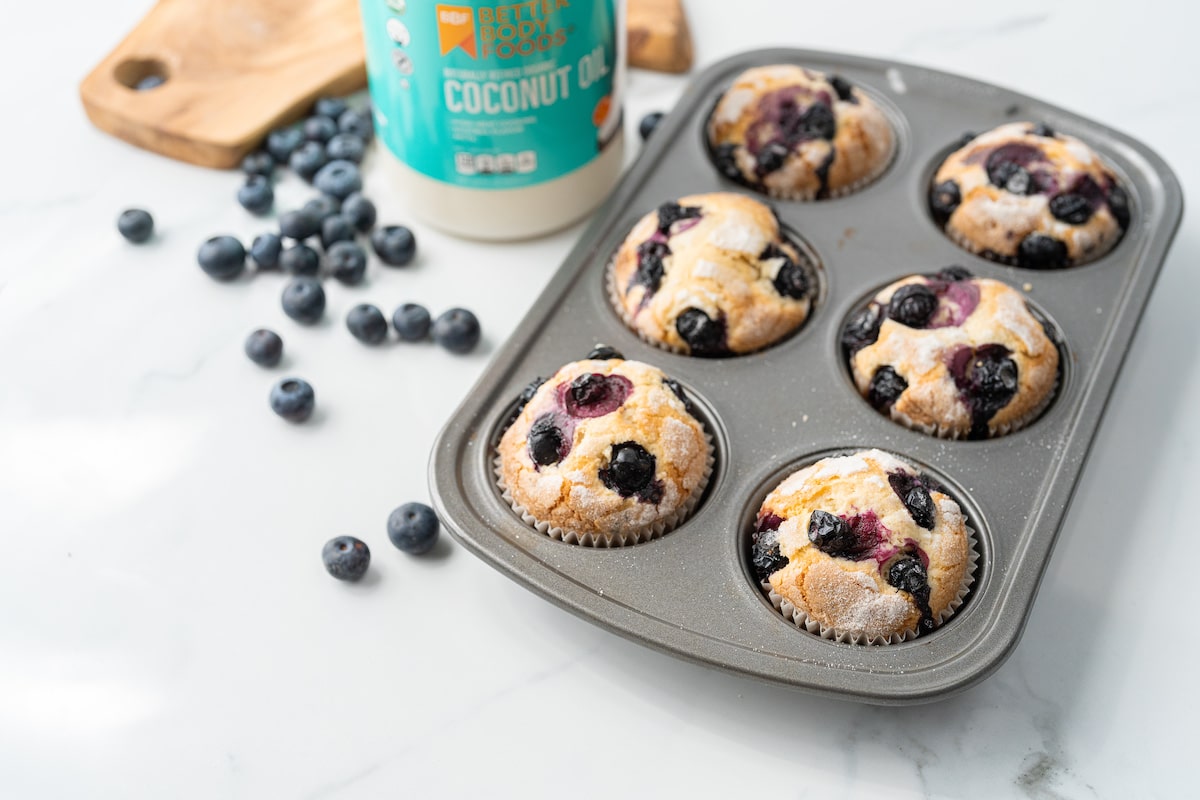 1. Prepare the oven and muffin cups. 2. Heat oven to 400 ° F. Line 8 standard-size muffin cups with paper liners. 3. Whisk the flour, sugar, baking powder, and salt in a large bowl. 4. Add melted coconut oil to a measuring jug that holds at least 1 cup. Add the egg, then fill the jug to the 1-cup line with milk (1/3 to 1/2 cup milk). Add vanilla and whisk to combine. 5. Add milk mixture to the bowl with dry ingredients, then use a fork to combine. Refrain from over-mixing. (The muffin batter will be pretty thick). Fold in the blueberries. 6.Divide the batter between muffin cups. Sprinkle a little sugar on top of each muffin. 7. Bake muffins for 15 to 20 minutes or until tops are no longer wet and a toothpick inserted into the middle of a muffin comes out with crumbs, not wet batter. Transfer to a cooling rack. 8. To store, place them in a plastic bag, seal them, and keep them at room temperature for 2 to 3 days. To freeze, wrap them tightly in aluminum foil or freezer bags. Freeze for up to 3 months. 9. Enjoy your Blueberry Muffins!