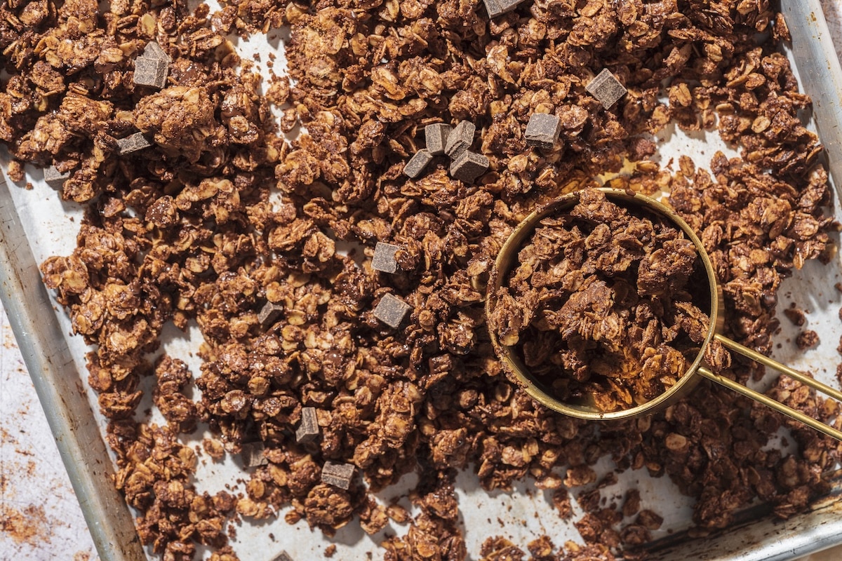 1. Preheat oven to 325°F. Line a baking sheet with parchment paper. 2. In a large bowl, combine the oats, flaxseed, BetterBody Foods Cacao Powder, salt, cinnamon. Stir to combine. Add in avocado oil and peanut butter. Stir until well combined and all oats are coated well. 3. Transfer the mixture to the prepared baking sheet and spread into an even layer. Bake for 25-30 minutes, stirring once at about 15 minutes in to redistribute the oats. 4. Remove from the oven and sprinkle the chopped chocolate over the top. Stir slightly (just a couple of swirls) to form some clusters. Allow to cool completely before storing in an airtight container at room temperature. Makes about 6 cups. 5. Enjoy your Chocolate Granola!