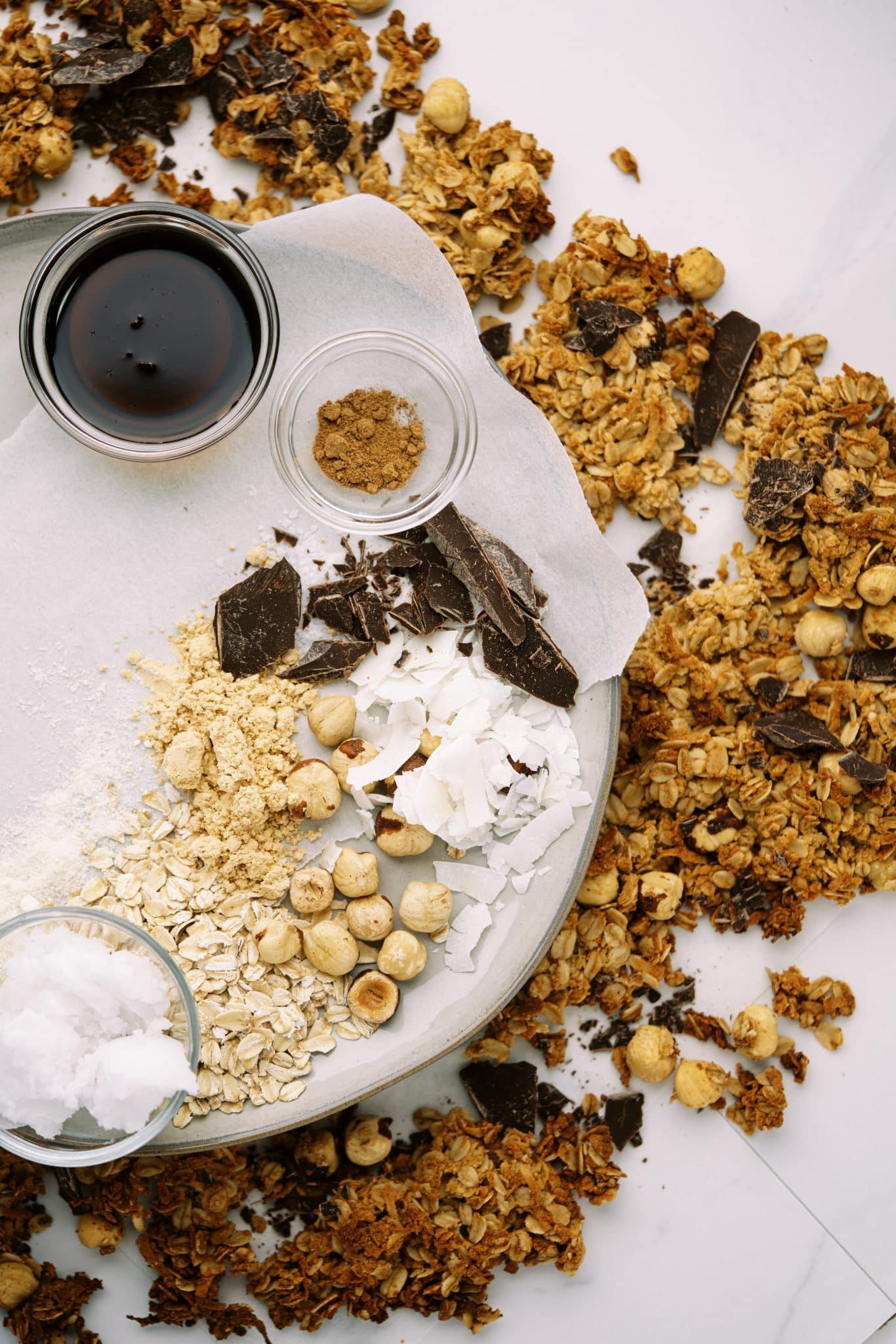 1 cup dark chocolate chips (reserve and fold in at the end when granola is cooled)
