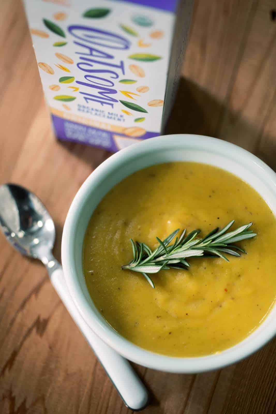 1. In a large pan, heat oil, onion and garlic over medium heat for 3 minutes. 2. Add carrots and sauté for 3 more minutes. 3. Add potatoes, vegetable stock, thyme and rosemary, and cook for 15-20 minutes or until potatoes are soft. 4. Puree in batches in a high speed blender. 5. Once pureed, add back to pan and heat for an additional 20 minutes. 6. Top with fresh rosemary.