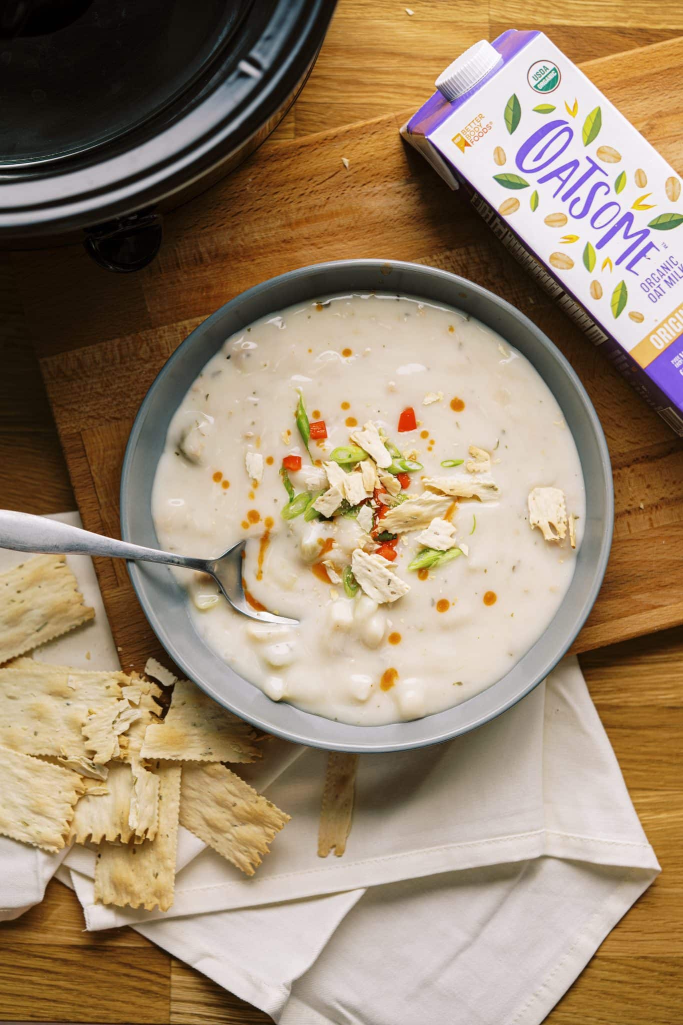 1. In a large stock pot pour clam juice and oat milk in the pot and bring to a boil.