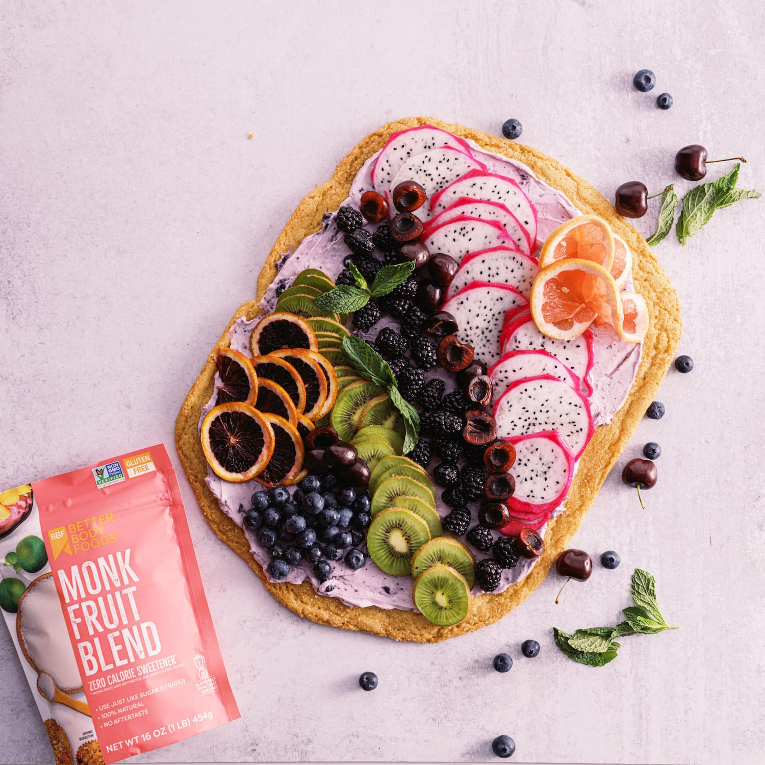 Heat oven to 350°F. Grease either a quarter sheet pan, a 9 x 13-inch baking dish, or a 12-inch round pizza pan with cooking spray. In a medium bowl, whisk together the flour, baking powder, and salt; set aside. In a large mixing bowl either with a stand mixer (with the blade attachment) or hand mixer, beat the butter and sugar together on medium speed until light and fluffy, about 2 minutes. Add the egg, and vanilla and mix on medium speed until completely combined, scraping down the sides partway through if needed. Add in the dry ingredients, and beat on low speed until just combined. (Avoid over-mixing the dough.) Press the dough evenly into the prepared pan/dish*. Use a fork to poke a few holes in the dough, to prevent it from bubbling up. Bake for 15-18 minutes, or until the dough is lightly golden. Transfer to a wire baking rack to let cool for 20 minutes. Meanwhile, whisk together the frosting ingredients until combined. Spread the frosting out evenly on the baked cookie crust. Sprinkle with your favorite fruit, and sprinkle with a bit of monk fruit if desired. Slice, serve and enjoy!