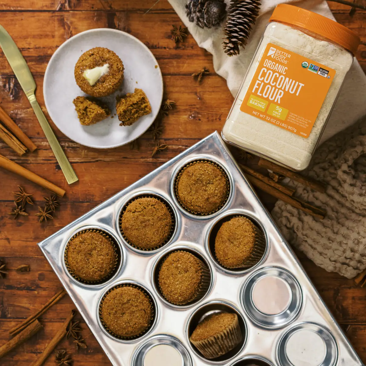 1. Preheat the oven to 375°F and line a muffin tin with paper liners. 2. In a medium bowl, combine the almond flour, BBF Coconut Flour, spices, and baking soda; stir until well mixed. 3. Add the eggs, molasses, butter, maple syrup, and vanilla to the bowl, and stir until fully combined. 4. Scoop the batter into the prepared muffin tin and sprinkle with raw sugar, if desired. 5. Bake for 18–20 minutes, or until a toothpick inserted into the center comes out clean. 6. Remove from the oven and let cool before serving. 7. Enjoy your Gingerbread Muffins!