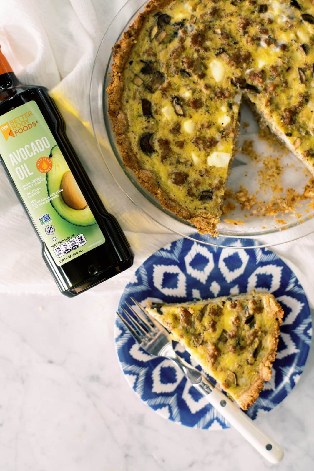Preheat the oven to 400 degrees In a bowl combine all of the crust ingredients. Mix well until all incorporated. 1. Place dough in a 9-inch pie pan, using your hands press the dough in the pan to form the crust. Bake for 15 mins. 2. While crust is baking, Saute the shallot, mushrooms, and sausage for 6 mins. Set aside to cool. 3. In a bowl, combine the almond milk, eggs, and salt. Whisk until well combined. Add the cooled sausage and veggie mixture, and cheese. Pour egg mixture into your baked crust. 4. Place in oven at 375 degrees and cook for 30 mins. 5. Remove and enjoy!