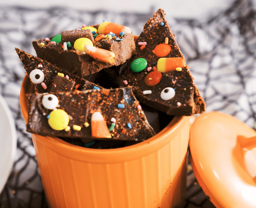 1. Line a 8x8 pan with parchment paper and set aside. 2. In a small pan, combine the coconut oil, cacao, Pbfit, agave, and salt 3. Heat over medium heat and whisk until smooth and together. Does not need to boil. 4. As soon as it is smooth, pour into prepared pan. 5. Sprinkle your Halloween candy on top of the chocolate mixture and place in fridge until set. For at least 2 hours. 6. Remove from fridge and pan and cut into portions. 7. Enjoy!