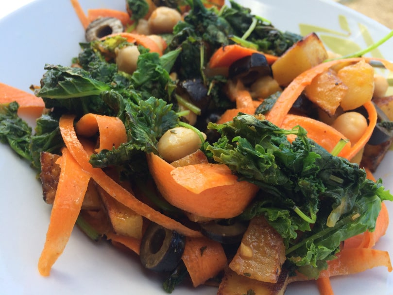 3. Assemble the salad with your potatoes, kale, carrots, olives and the homemade mustard dressing.