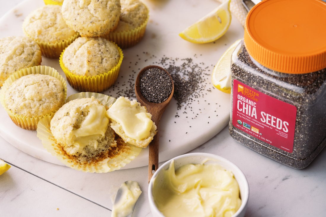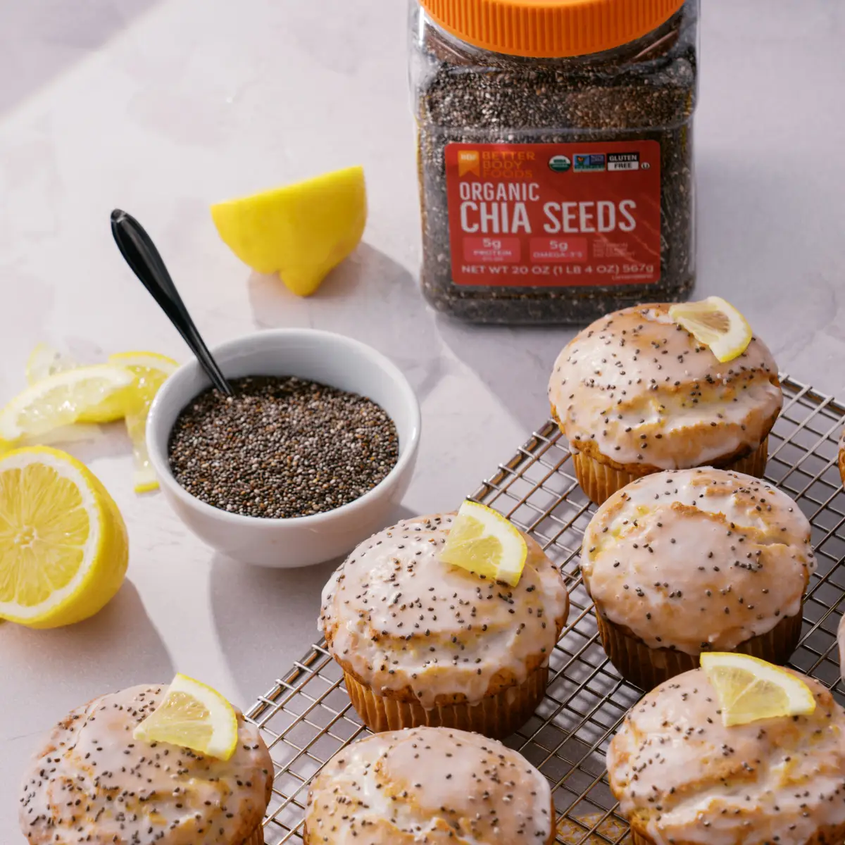For muffins: In a large bowl, sift together flour, baking powder, and baking soda. Whisk in chia seeds and salt.