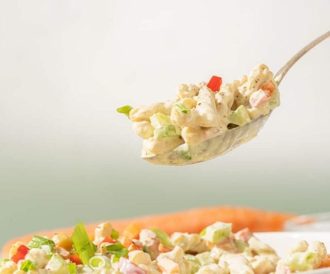3. Add the cooked pasta, carrots, celery, bell pepper, and scallions to the bowl and stir until evenly combined. Taste and adjust seasoning if necessary.