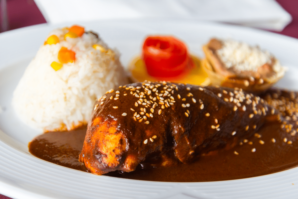 8. Serve chicken with the mole sauce with a side of rice and grilled veggies.