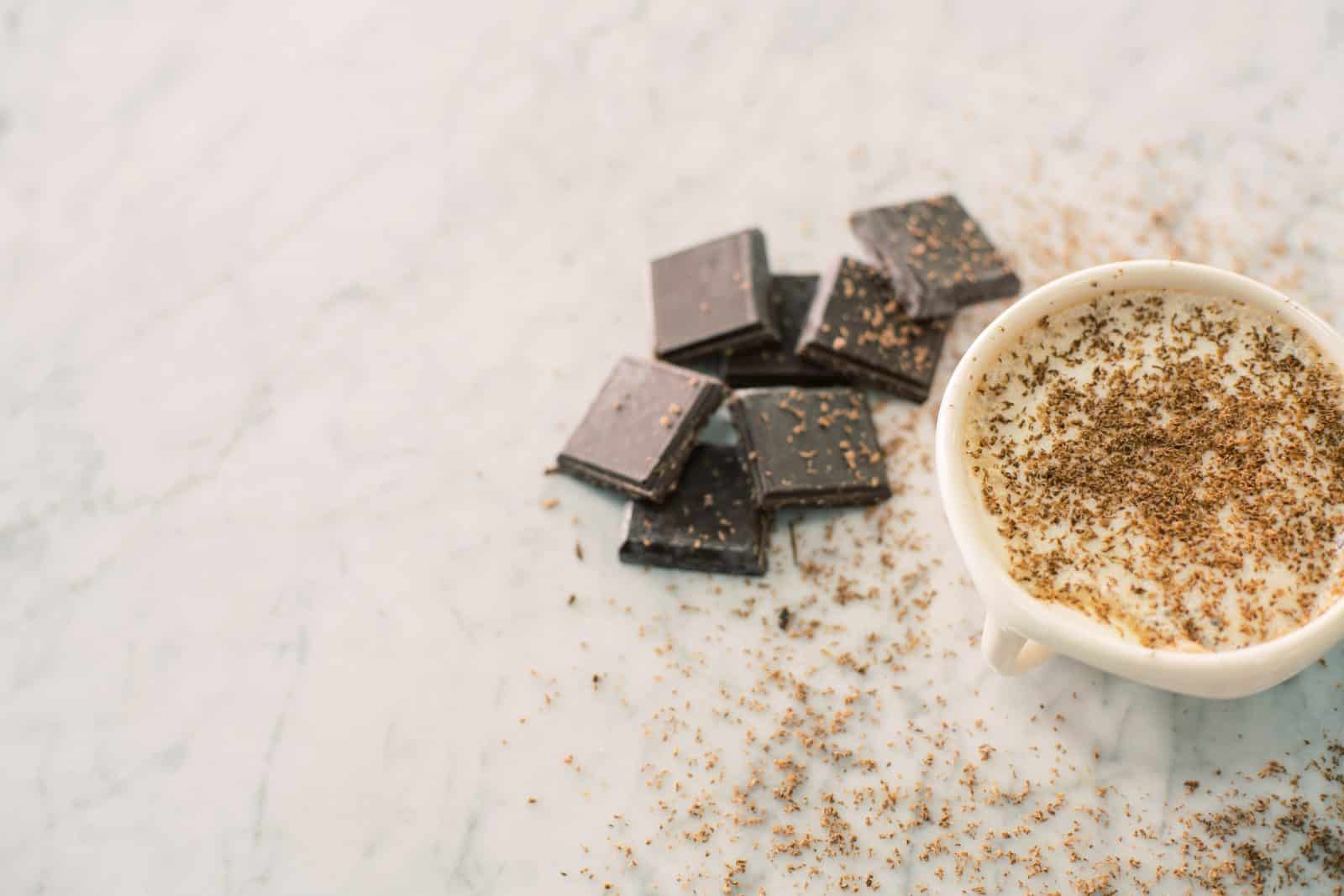 1. Brew coffee 2. Stir in monk fruit and cacao 3. Heat oat milk in microwave for 30 seconds 4. Froth until light and foamy 5. Top coffee with frothed oat milk and sprinkle with shaved chocolate.
