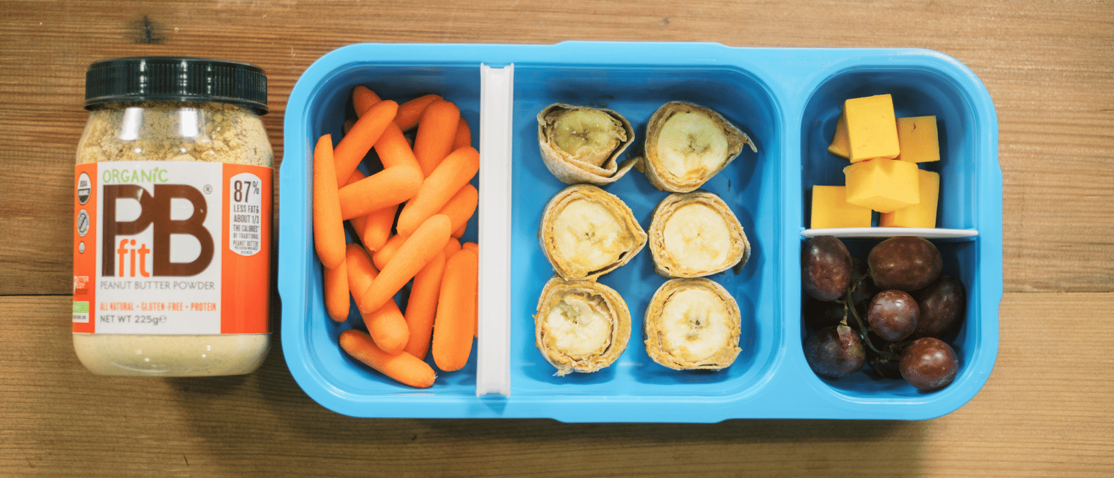 1. Mix the Pbfit powder with the water to make the peanut butter. 2. Spread half of the peanut butter on each tortilla. 3. Add a peeled banana on one end of the tortilla and roll it up. 4. Slice the banana filled tortilla into bite sized pieces. 5. Enjoy