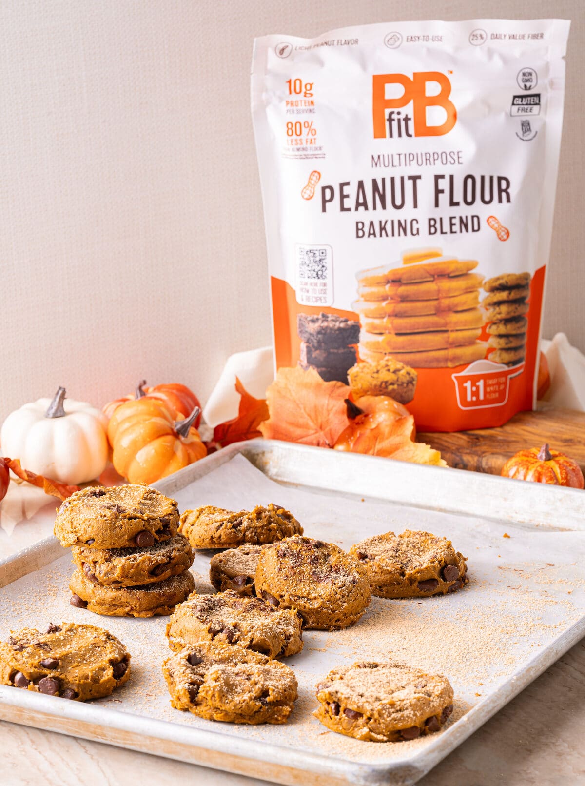 1. Preheat the oven to 350 ° F. Line baking sheets with silicone baking mats or parchment paper. 2. In a mixing bowl, whisk together PBfit Peanut Flour Baking Blend, baking powder, baking soda, cinnamon, nutmeg, ginger, cloves, and salt for 20 seconds, and set aside. 3. In the bowl of an electric stand mixer fitted with the paddle attachment, blend granulated sugar, brown sugar, and oil until combined. 4. Mix in egg and vanilla, then blend in pumpkin puree. 5. With the mixer on low speed, slowly add the flour mixture and mix until nearly combined, scraping down the sides of the bowl as needed. Mix in chocolate chips. 6. Drop dough 2 Tbsp (either using a medium cookie dough scoop or two spoons) at a time onto baking sheets lined with Silicone liners or parchment paper, spacing cookies two inches apart. 7. Bake in a preheated oven until cookies are nearly set, about 11 - 13 minutes. 8. Allow to cool for several minutes before transferring to a wire rack to cool. 9. Enjoy your Pumpkin Chocolate Chip Cookies!