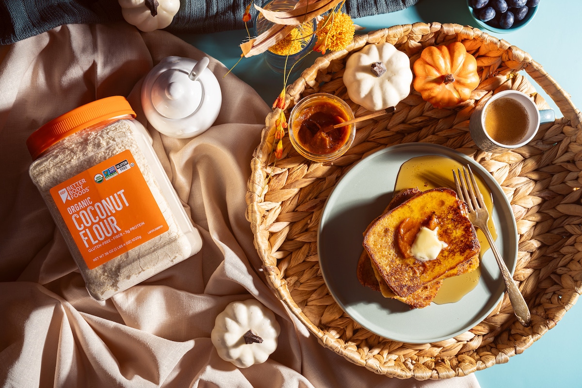 For the pumpkin bread: 1. Preheat oven to 350 ° F. 2. Combine the melted butter, eggs, almond milk, and pumpkin puree in a blender and blend until smooth. 3. Combine the almond flour, BetterBody Foods Coconut Flour, sweetener, baking powder, salt, and spices in a medium bowl and stir well. 4. Pour the blender ingredients into the dry ingredients and stir until well combined and moisture is absorbed. 5. Line a long, narrow loaf pan with parchment paper and spoon the batter into a 12 x 4 loaf pan. 7. Bake the bread at 350 ° F in the center of your oven for 60 minutes (or until a knife inserted in the center comes out clean.) 8. Turn off the oven and leave the bread there for an additional 15 minutes. Remove the bread from the oven and then from the pan using the parchment paper base to lift it out. 9. Cool on the counter or in the refrigerator, loosely covered for a minimum of 4 hours, but for best results, leave it overnight before slicing. For the french toast: 1. Combine the eggs, heavy whipping cream, cinnamon, and sweetener in a medium bowl and beat well until smooth. 2. Melt the butter in a nonstick saute pan over medium heat. 3. Carefully dip a slice of the pumpkin bread in the egg mixture on both sides for a few seconds, and cook in the butter for about 2 minutes per side or until golden brown. Remove the French toast to a warmed plate and repeat with the remaining slices. 4. Serve warm with butter and sugar-free syrup, cinnamon, and sweetener sprinkled over the top. 5. Enjoy your Pumpkin Spice French Toast!