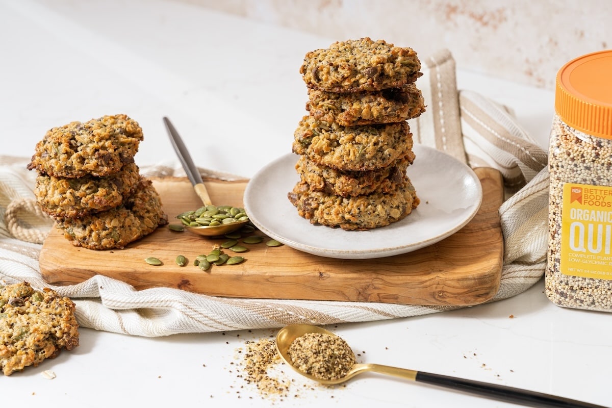 1. Prepare BetterBody Foods Quinoa in the Instant Pot or on the stovetop — a scant 1/4 cup uncooked quinoa will yield ~2/3 cup (124 g) cooked. 2. Preheat the oven to 350 degrees F (176 C) and line a baking sheet with parchment paper. Set aside. 3. To a medium mixing bowl, add 2/3 cup (124 g) of cooked BetterBody Foods Quinoa (adjust the amount if altering the default number of servings). Then add the rolled oats, pumpkin, and BetterBody Foods Super Seeds and stir well to combine. Next, add tahini, maple syrup, baking soda, sea salt, and optional chocolate chips. Stir well to incorporate fully. Scoop out dough in 1 ½ Tbsp amounts (we like using this scoop) and place on the prepared baking sheet. 4. The recipe, as written, should make 12 cookies. You can place them close together, as they don't expand. Gently press them with the palm of your hand, then bake for 14 -18 minutes until the edges are golden brown. 5. Let cookies cool for 5-10 minutes before transferring to a wire rack to cool completely — they'll firm up as they cool. Leftover cookies will be kept in an airtight container at room temperature for up to 2-3 days in the refrigerator for up to 4-5 days or in the freezer for 1 month or longer. 6. Enjoy your Quinoa Breakfast Cookies!
