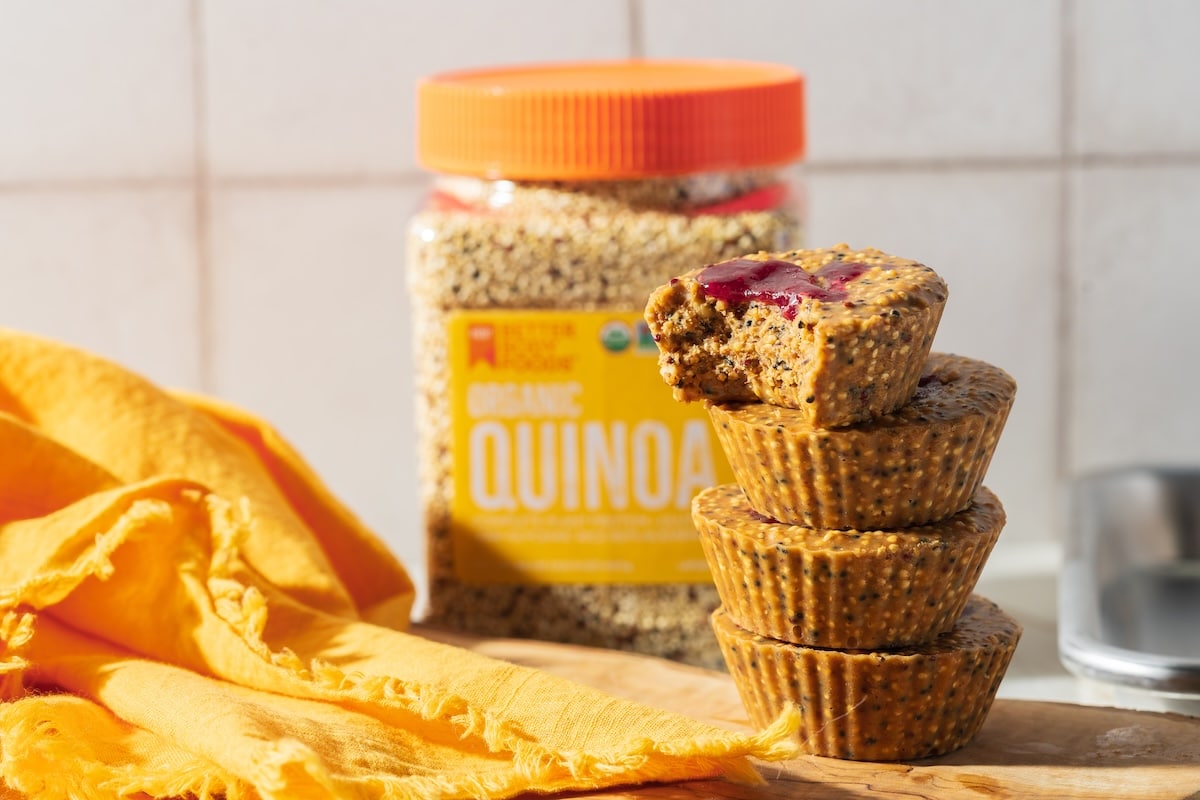1. Spray silicone muffin liners or pan with coconut oil, or line a muffin tin with muffin liners. Set it aside. 2. Next, heat a large skillet over medium/high heat and add 2 Tbsp of coconut oil to the pan. When the coconut oil is hot, add the BetterBody Foods Quinoa and toss with the coconut oil. Turn the heat to medium and continue stirring. You will begin to hear popping sounds after a few minutes. Stir the BetterBody Foods Quinoa with a spatula and allow the quinoa to pop and toast. Cook the BetterBody Foods Quinoa for about 5-6 minutes, stirring periodically to allow the quinoa to pop and turn golden brown. Remove the quinoa from the heat and add it to a large mixing bowl. 3. Add the peanut butter, coconut oil, honey, and peanuts to the BetterBody Foods Quinoa and mix until combined. Once combined, add 1.5-2 tablespoons of the quinoa mixture into each muffin cup. Shake the muffin pan to even the peanut butter mixture out. 4. Add ½ – 1 teaspoon of jam to each quinoa cup's top and swirl the jam on top of the cup with a knife or a toothpick. Sprinkle each cup with sea salt and place the muffin pan in the freezer for 30 minutes. 5. Remove the cups from the muffin tin into a freezer-safe container and store them in the freezer for up to 3 months. 6. Enjoy your Quinoa PB&J Cups!