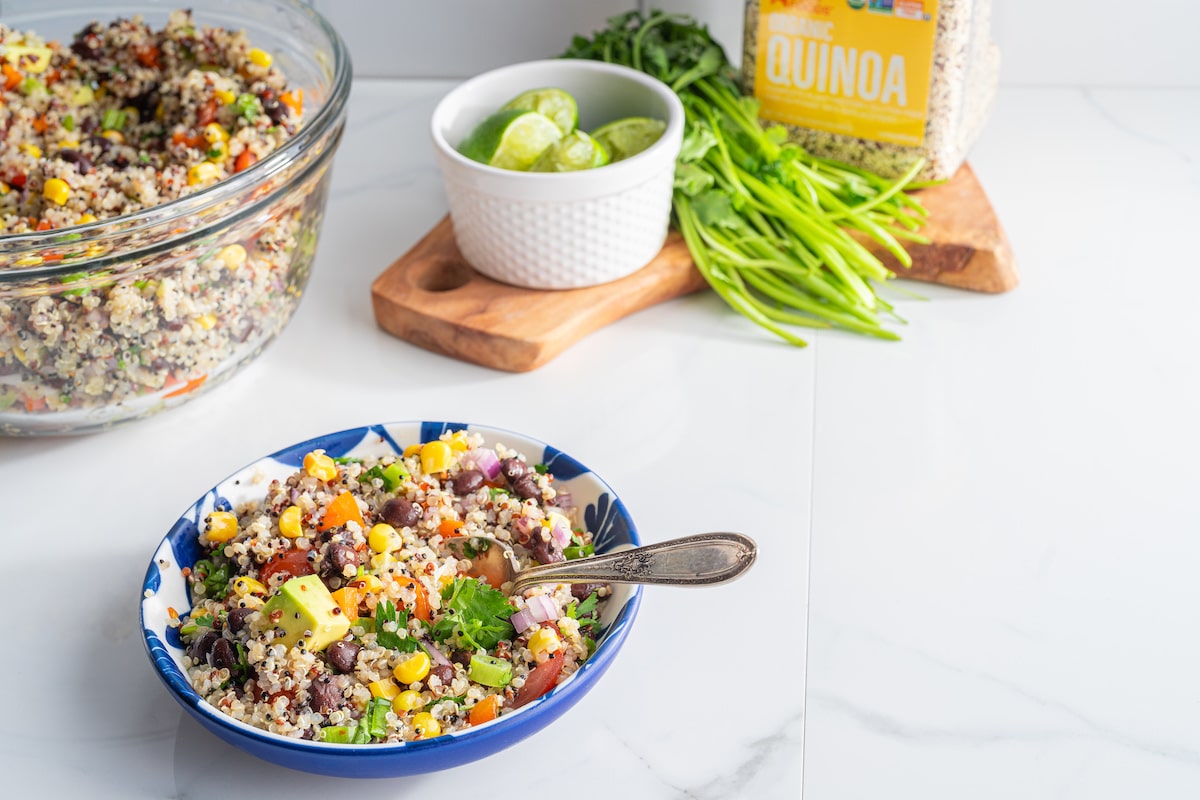 3.Combine quinoa, tomatoes, black beans, corn, avocado, red onion, yellow peppers, cilantro and green onions in a large bowl. Pour dressing over quinoa mixture; toss to coat and season with salt and black pepper.
