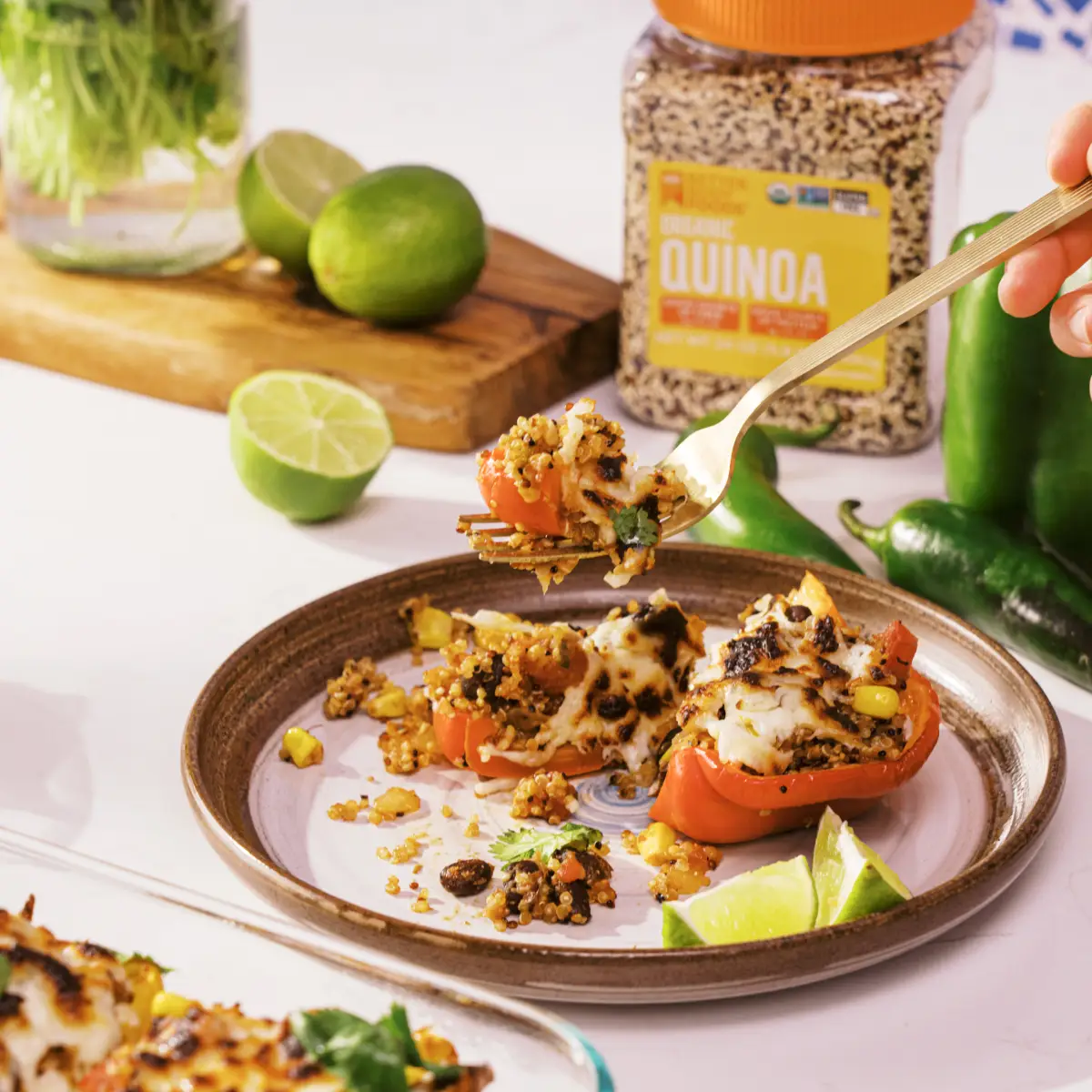 1. Preheat the oven to 400°F. 2. Heat the avocado oil in a large sauté pan over medium heat. Add the diced onion and sauté until softened and lightly golden. 3. Stir in the jalapeño, garlic, cumin, paprika, chili powder, garlic powder, salt, and quinoa. Toast for 45–60 seconds, stirring frequently. 4.Add the corn, black beans, fire-roasted tomatoes, and water. Cover with a lid and simmer until the quinoa is fully cooked, about 15–20 minutes. 5.While the quinoa cooks, halve the bell peppers and remove the seeds and ribs. Lightly brush with oil and place in a 9×13 roasting pan. Roast until just tender, about the same time the quinoa finishes cooking. 6.Once the quinoa is done, remove the partially roasted peppers from the oven and stuff each with 1/2–3/4 cup of the quinoa mixture. 7. Top each pepper with a handful of cheese and broil until the cheese is melted and golden brown. 8.Garnish with cilantro and serve. 9.Enjoy your Quinoa Stuffed Peppers!