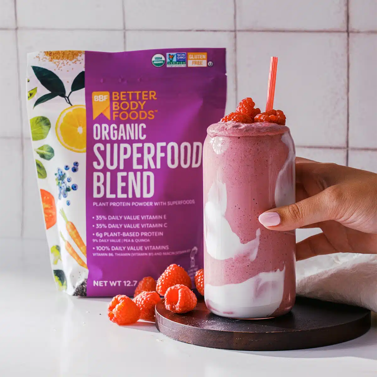 2. If desired smear a little yogurt inside of your glass and pour the smoothie into the glass and top with a handful of fresh raspberries.
