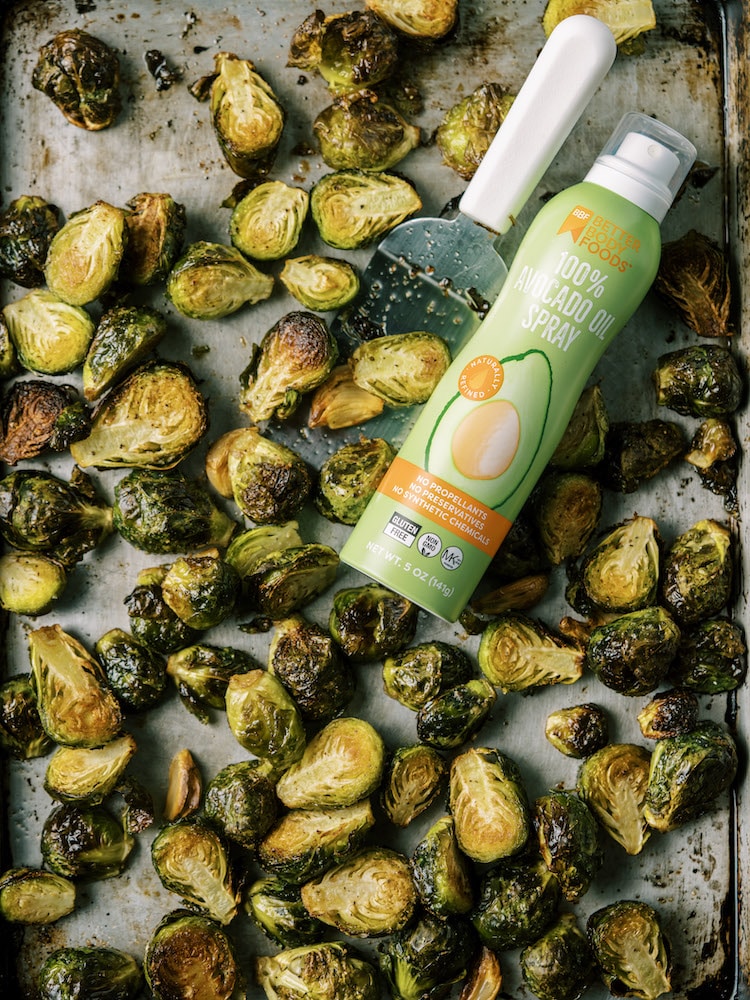 Preheat the oven to 400 degrees F. Cut off the brown ends of the Brussels sprouts and pull off any yellow outer leaves. Lightly spray sheet pan with avocado spray. Pour brussel sprouts onto the sheet pan and lightly spray with avocado oil and sprinkle with salt and pepper. Roast for 35 to 40 minutes, until crisp on the outside and tender on the inside. Shake the pan from time to time to brown the sprouts evenly. Sprinkle with more kosher salt, and serve immediately.