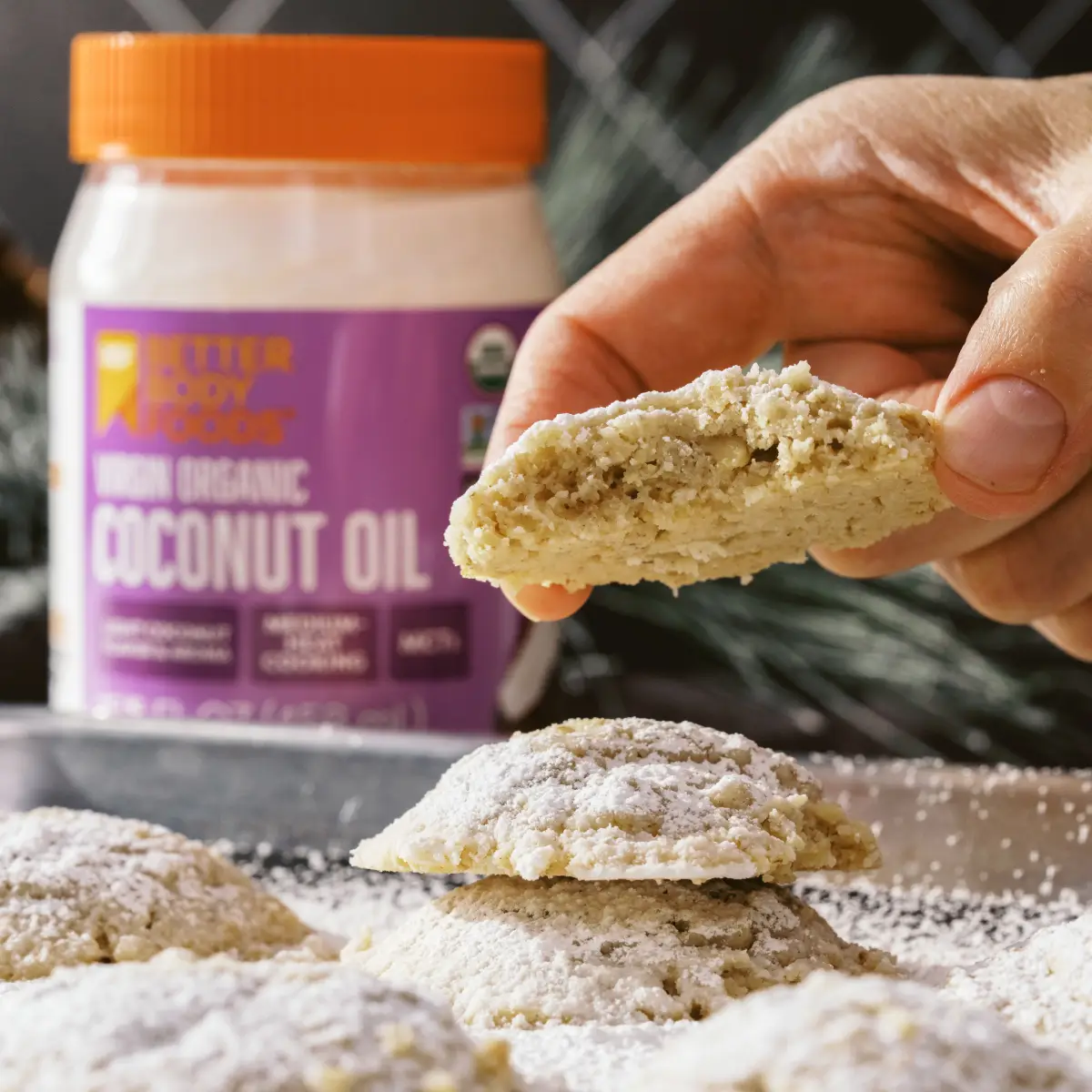 1. Preheat your oven to 375°F (190°C) and line a baking sheet with parchment paper. 2. In a food processor, add the flour, powdered sugar, nuts, and salt. Process for 30 seconds. Add the BBF Coconut Oil and vanilla, and continue processing until the ingredients come together to form a soft dough. Chill the dough for 30 minutes. 3. Shape the dough into small balls and place them on the prepared baking sheet. 4. Bake for 15 to 18 minutes, or until the bottoms are lightly browned. 5. Allow the cookies to cool completely, then dust them with powdered sugar. 6. Enjoy your Snowball Cookies!