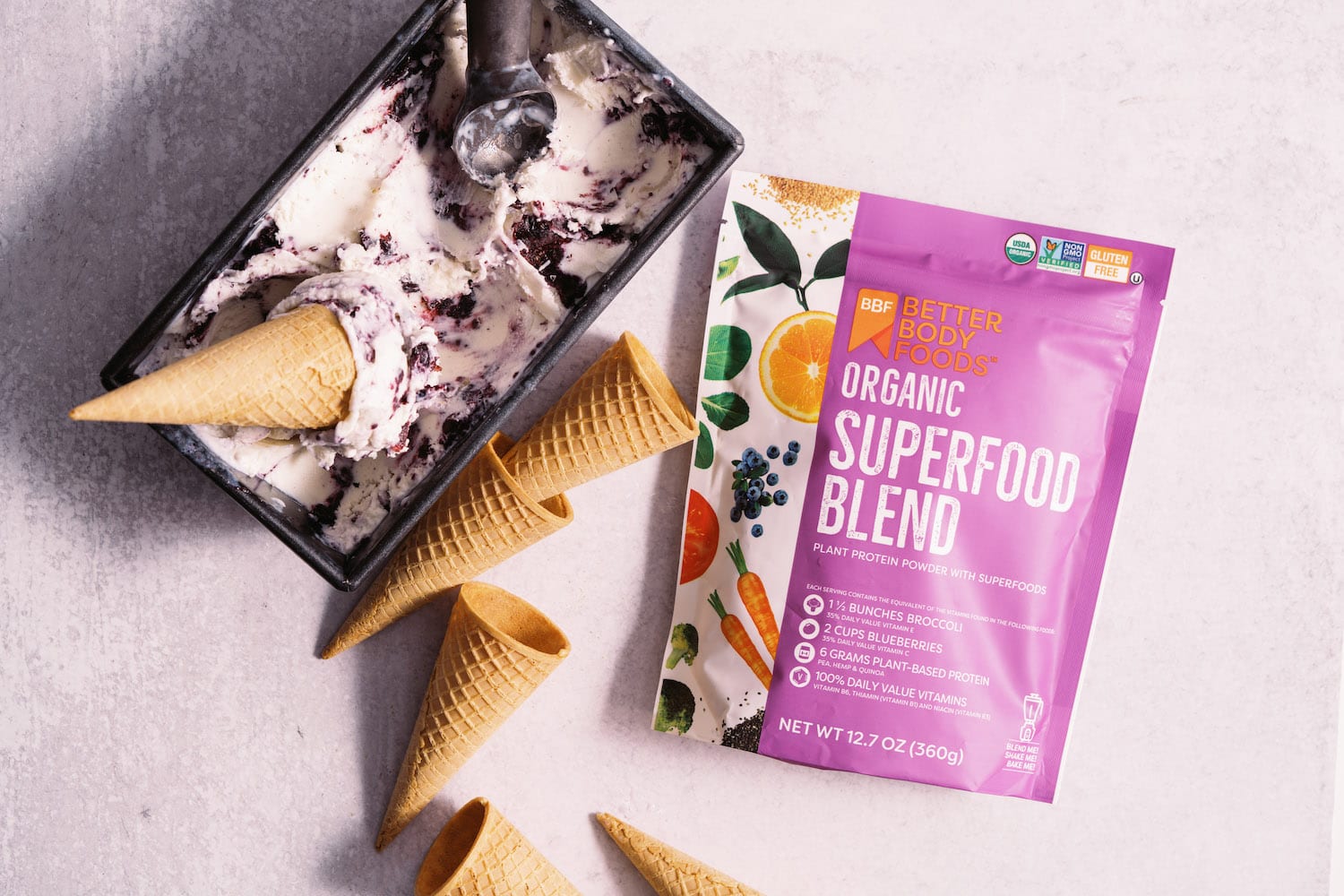 In a bowl, whisk together the milk and sugar until sugar is dissolved. Then stir in the superfood blend. Stir in heavy cream and vanilla, and whisk to combine well. Turn on the ice cream machine and pour the milk/cream mixture in. Follow directions on your ice cream maker for churning; generally about 25-30 minutes. Once ice cream is ready gently swirl in blueberry jam and then pour into a freezer-safe container and freeze for 2-4 hours till firm.