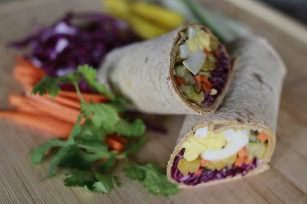 1. Lay out wrap and layer with julienned veggies of your choice.