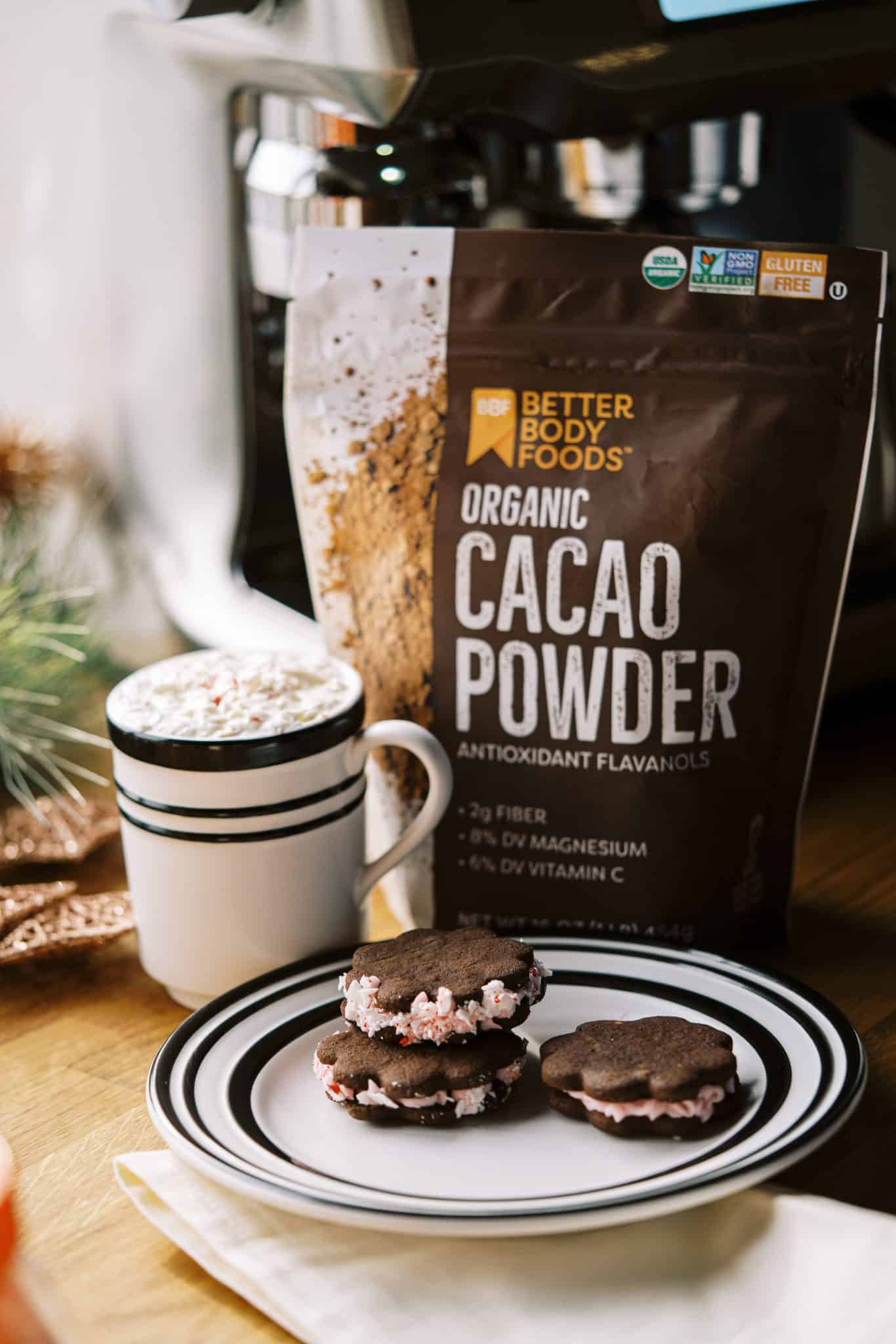 1. In the bowl of an electric mixer fitted with the paddle attachment, cream vegan butter until smooth and creamy. Add in the peppermint extract, cacao powder and half a cup of powdered sugar, and one tbsp of oat milk. Mix well.