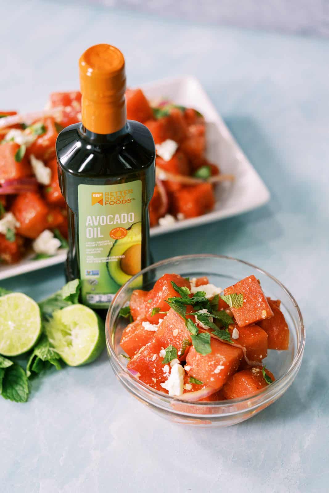 1. Cut your watermelon into 1” cubes and place in a large bowl. 2. Add your thinly sliced red onions, and feta cheese crumbles. 3. In a small bowl, whisk together your avocado oil and red wine vinegar and season with salt and pepper. 4. 10 minutes before you are ready to serve, pour the dressing over your watermelon mixture. Toss to combine. Add the mint and squeeze the lime juice on top. Gently toss to combine. 5. Enjoy.