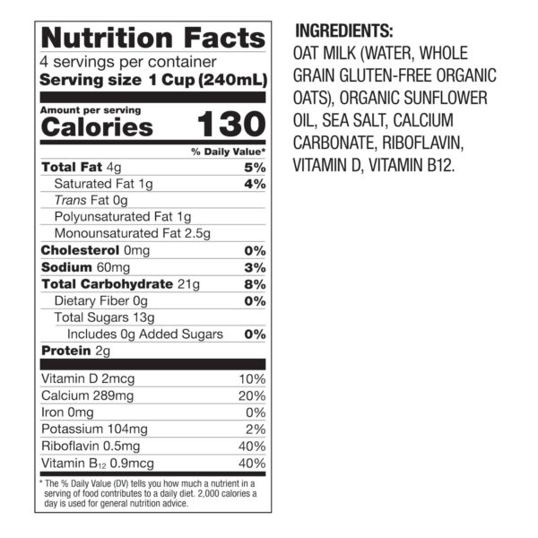 Oat Milk (Water, Whole Grain Gluten-Free Organic Oats), Organic Sunflower Oil, Sea Salt, Calcium Carbonate, Riboflavin, Vitamin D, Vitamin B12.