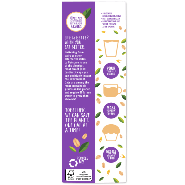Oatsome is packaged in what’s called aseptic packaging, which means both the delicious milk inside and the packaging itself are completely sterile during the filling process. This means you get a great tasting product that doesn’t have to be refrigerated before opening.