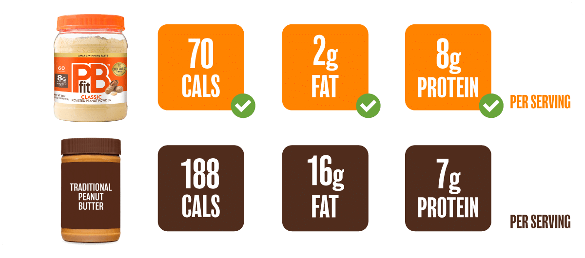 *Traditional peanut butter has 16g fat compared to 2g fat in PBfit per prepared 32g (16g dry) serving.